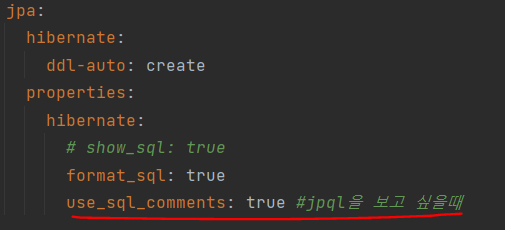 - Jpql에 실행되는 쿼리를 보고 싶다면, application.yml를 수정하면 된다.