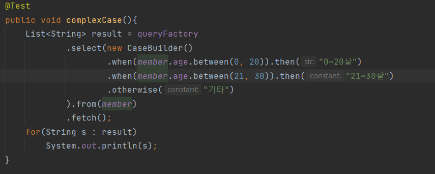member.age.stringValue() 부분이 중요한데, 문자가 아닌 다른 타입들은 stringValue() 로 문자로 변환할 수 있다. 이 방법은 ENUM을 처리할 때도 자주 사용한다