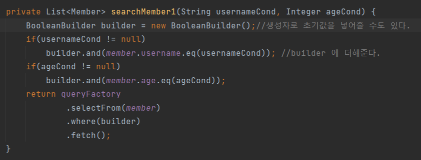 - 초깃값을 넣어 줄 수도 있고, builder에 조건을 계속 더해서 사용이 가능하다.