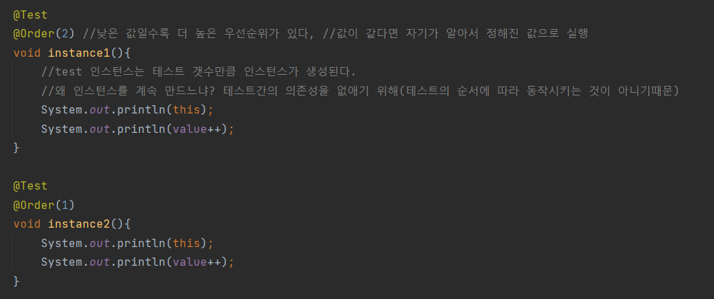- 그 경우에는 테스트 메소드를 원하는 순서에 따라 실행하도록
