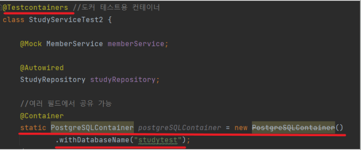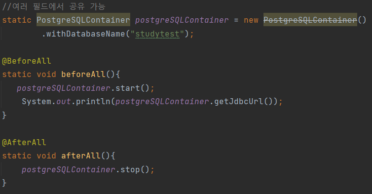 - @Container = 인스턴스 필드에 사용하면 모든 테스트 마다 컨테이너를 재시작하고, 스태틱 필드에 사용하면 클래스 내부 모든 테스트에서 동일한 컨테이너를 재사용한다.