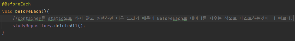 단 컨테이너가 인스턴스를 공유하기 떄문에 테스트를 실행후 데이터를 비워주어야 한다.