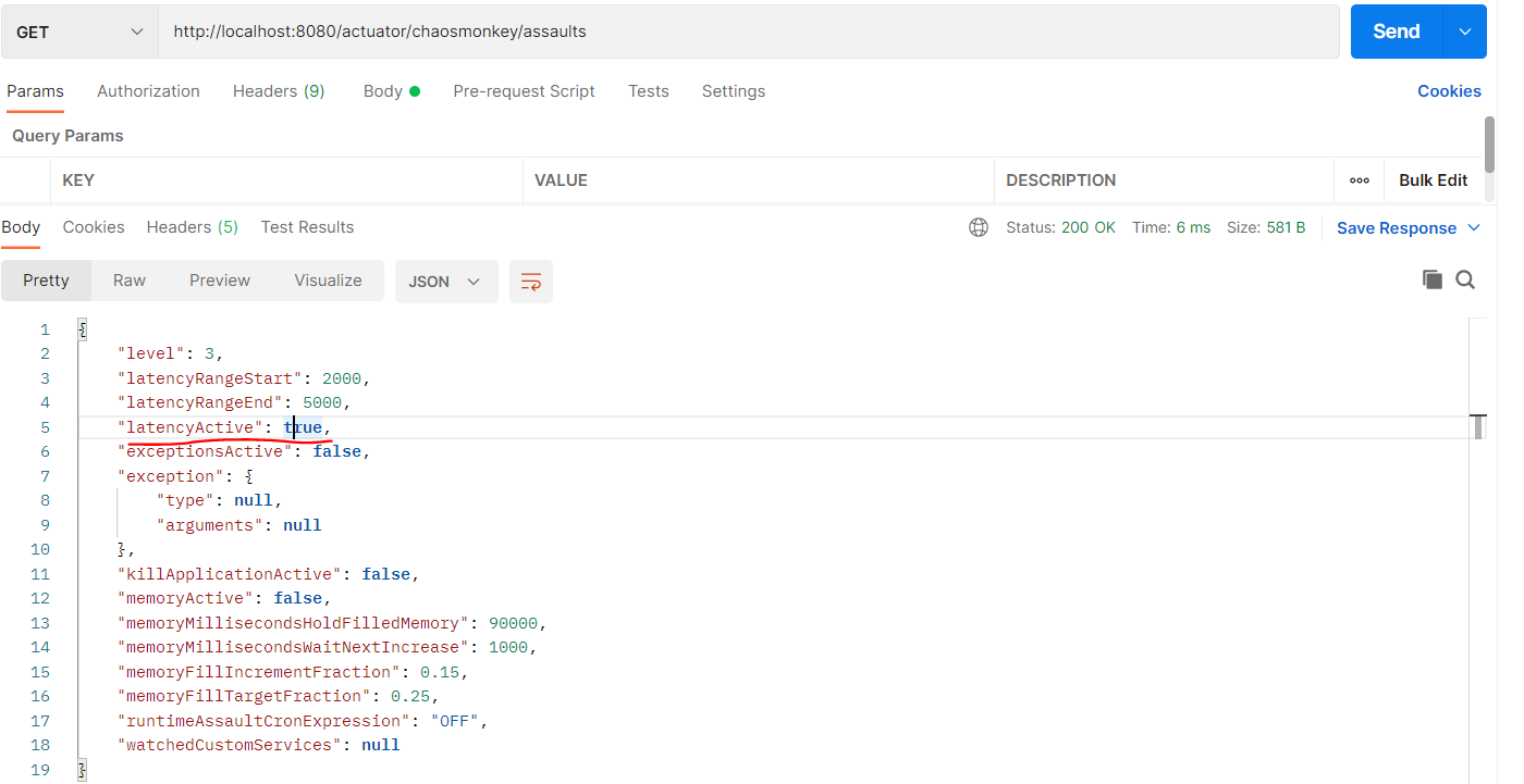• 카오스 멍키 지연 공격 설정 http POST localhost:8080/actuator/chaosmonkey/assaults level=3 latencyRangeStart=2000 latencyRangeEnd=5000 latencyActive=true