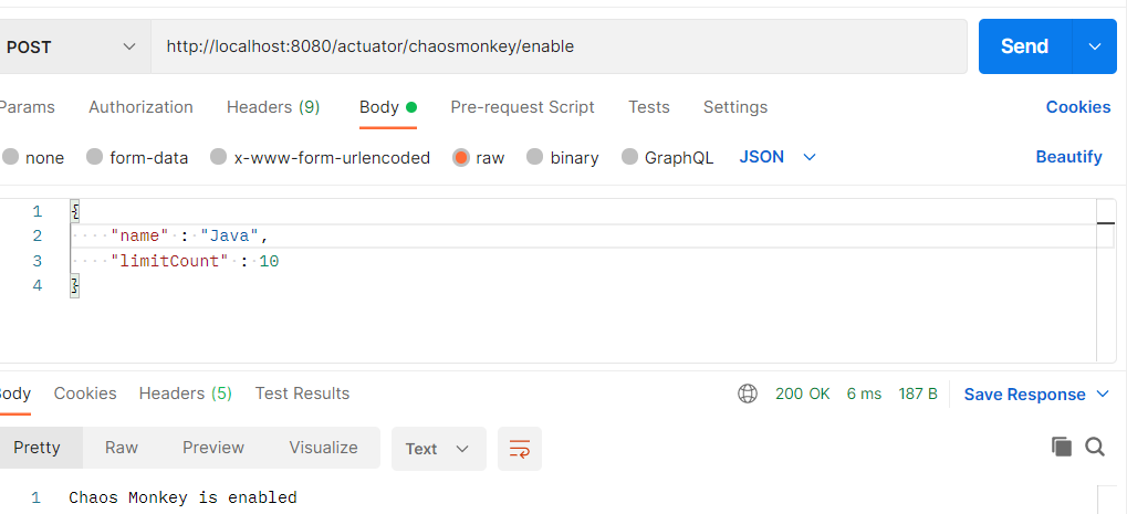 • 카오스 멍키 활성화 확인 http://localhost:8080/actuator/chaosmonkey/status