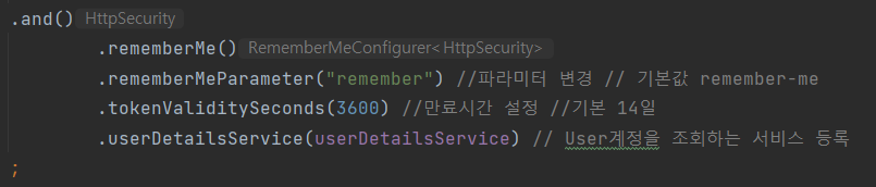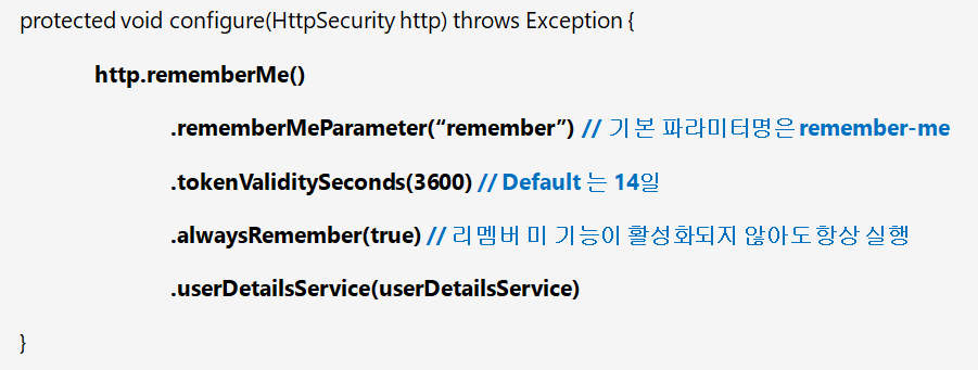 - rememberMeParameter : 파라미터를 변경해준다(기본값 = remember-me)