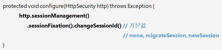 세션 고정 보호 - changeSessionId : 기본값으로 새로운 세션 Id만 발급해준다