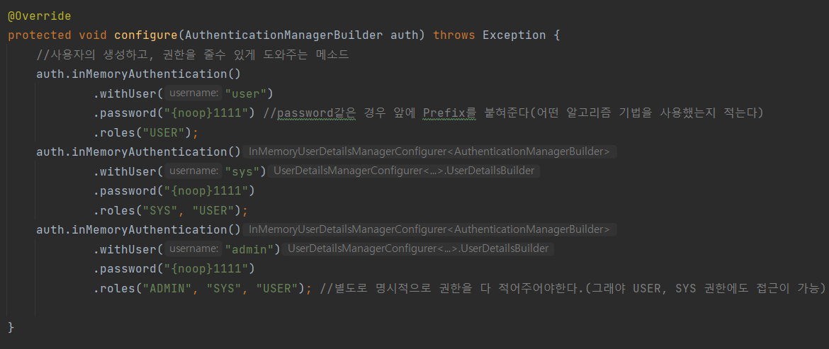 권한 설정하기 - 실무에서는 동적으로 권한 설정이 되고, 사용자 권한 또한 DB에서 읽어 동적으로 주기 때문에 이러한 방식은 사용하지 않는다.