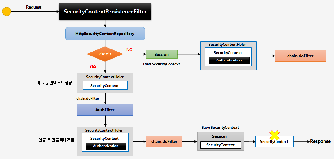 - 클라이언트에 응답할 때, SecurityContextPersistenceFilter가 세션에 SecurityContext를 저장한 뒤, SecurityContext 자원을 삭제해 준다.
