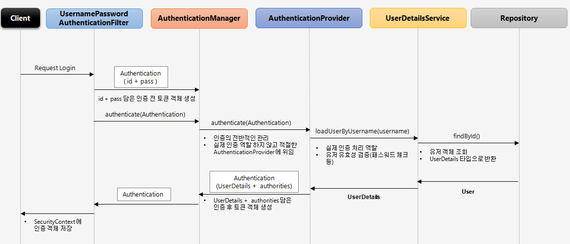 - 인증이 성공하면 Authentication(UserDetails + authorities) 객체를 만들어 UsernamePasswordFilter에 전달한다.