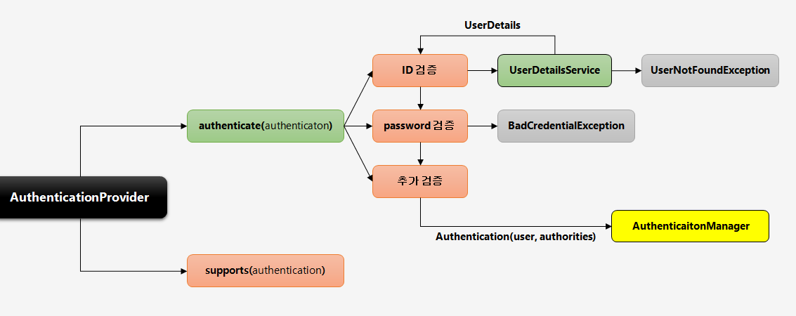 - password검증 : ID검증에서 반환 받은 UserDetails와 위임받은 authentication 객체의 password를 비교하여 일치하는지 검증한다.(일치하지 않을 경우, BadCredentialException)