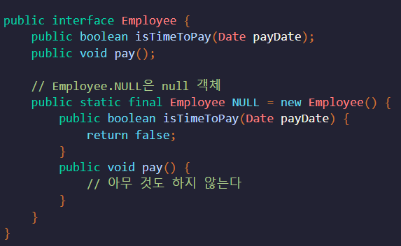 - 만약 존재하지 않는 직원을 조회했을 때 null을 리턴하는 것이 아니라, Employee 인터페이스를 구현하면서 아무 일도 하지 않는 Employee 구현체 인스턴스를 리턴하게 하면 다음과 같이 null 체크 코드를 삭제할 수 있다