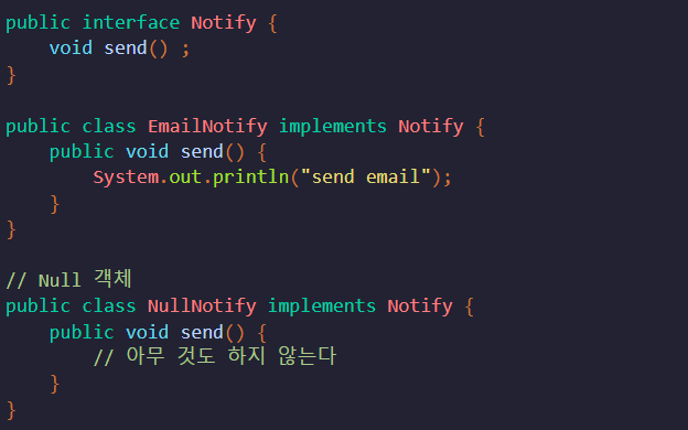 - 인터페이스를 통해 관계를 느슨하게 만든 뒤, Null 객체를 만들어 null일 경우 해당 객체를 반환하는 것이다.