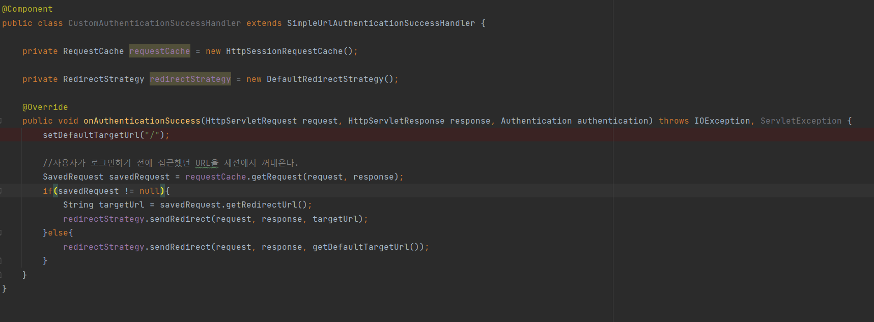 • saveRequest가 Null일 경우는 인증전 사용자가 접근했던 URL이 없는 것으로 /로 이동한다.
