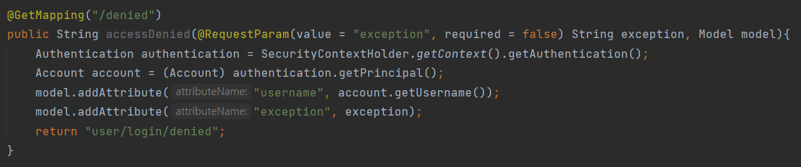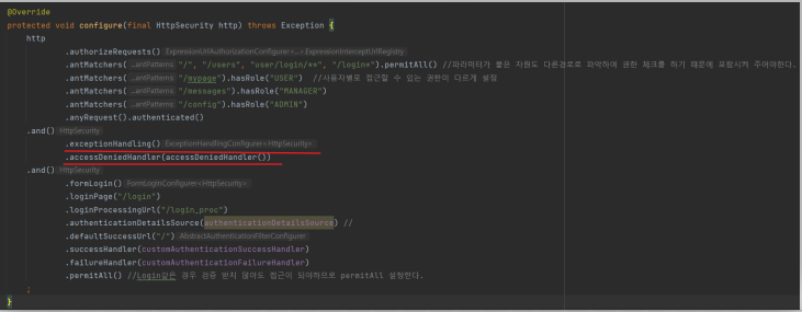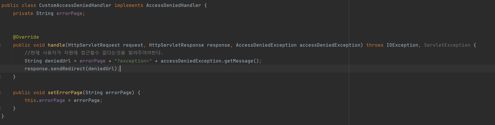 인증은 성공했으나 권한이 없는 사용자가 접근할 경우 해당 핸들러를 실행시켜준다. - 사용자가 접근할수 없는 URL인 것을 알려주고, 파라미터로 Exception을 전달하여 준다.