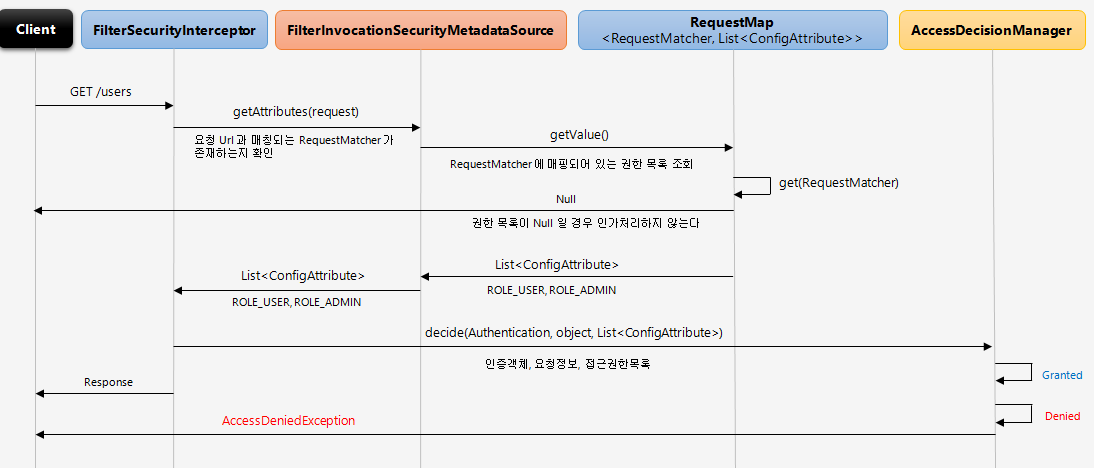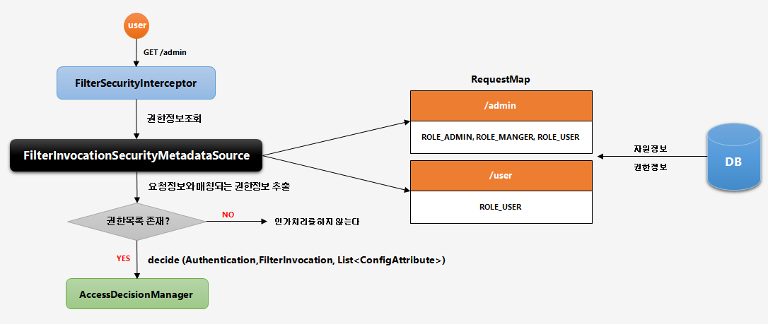 - 사용자의 매 요청마다 요청정보에 매핑된 권한 정보 확인