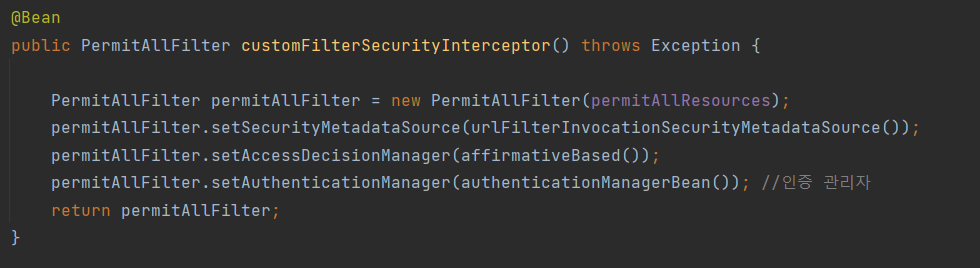 • PermitAllFilter를 먼저 작성하여, 실제 권한 심사가 필요 없는 요청은 AbstractSecurityInterceptor에 인가를 요청하지 않도록 구현한다.