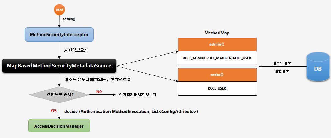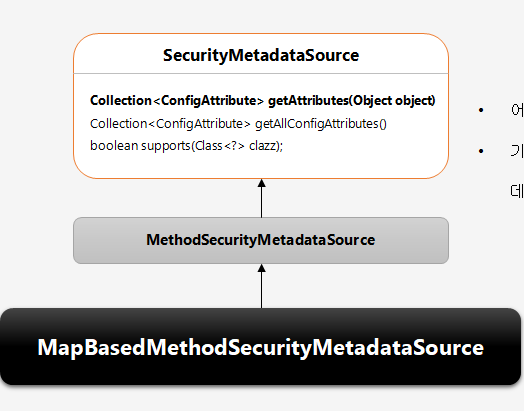 - 권한 정보를 MapBasedMethodSecurityMetadataSource에 요청한다.