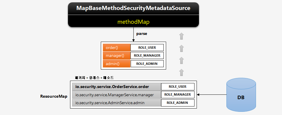 DB로 부터 얻은 권한/자원 정보를 ResourceMap을 빈으로 생성해서 MapBasedMethodSecurityMetadataSourceMapBasedMethodSecurityMetadataSource 에 전달