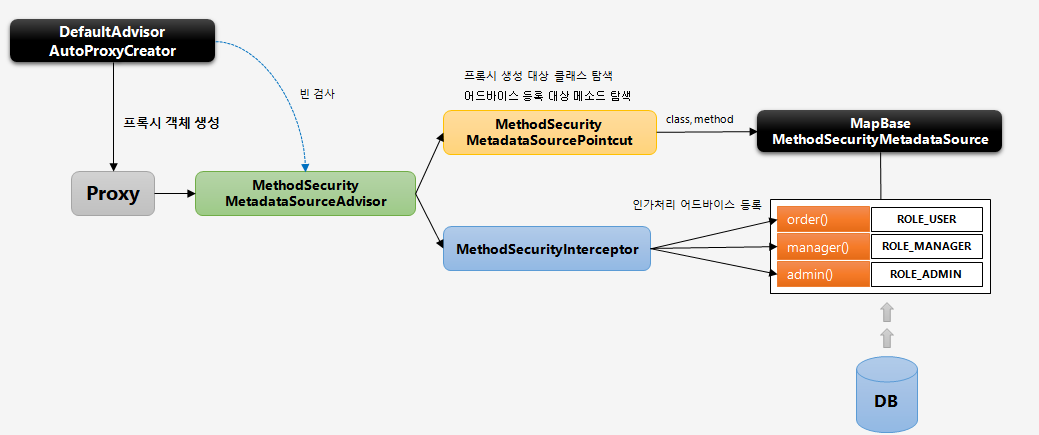 - DefaultAdvisorAutoProxyCreator가 MethodSecurityMetadataSourceAdvisor를 통해 프락시 객체를 생성한다.