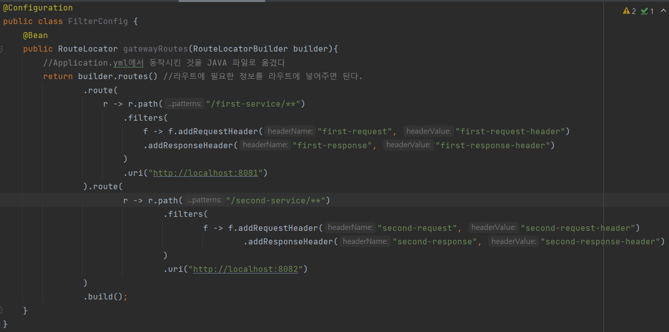 - filter : 어떤 동작을 할지 -> 현재는 RequestHeader, ResponseHeader을 값을 추가해 주었다.