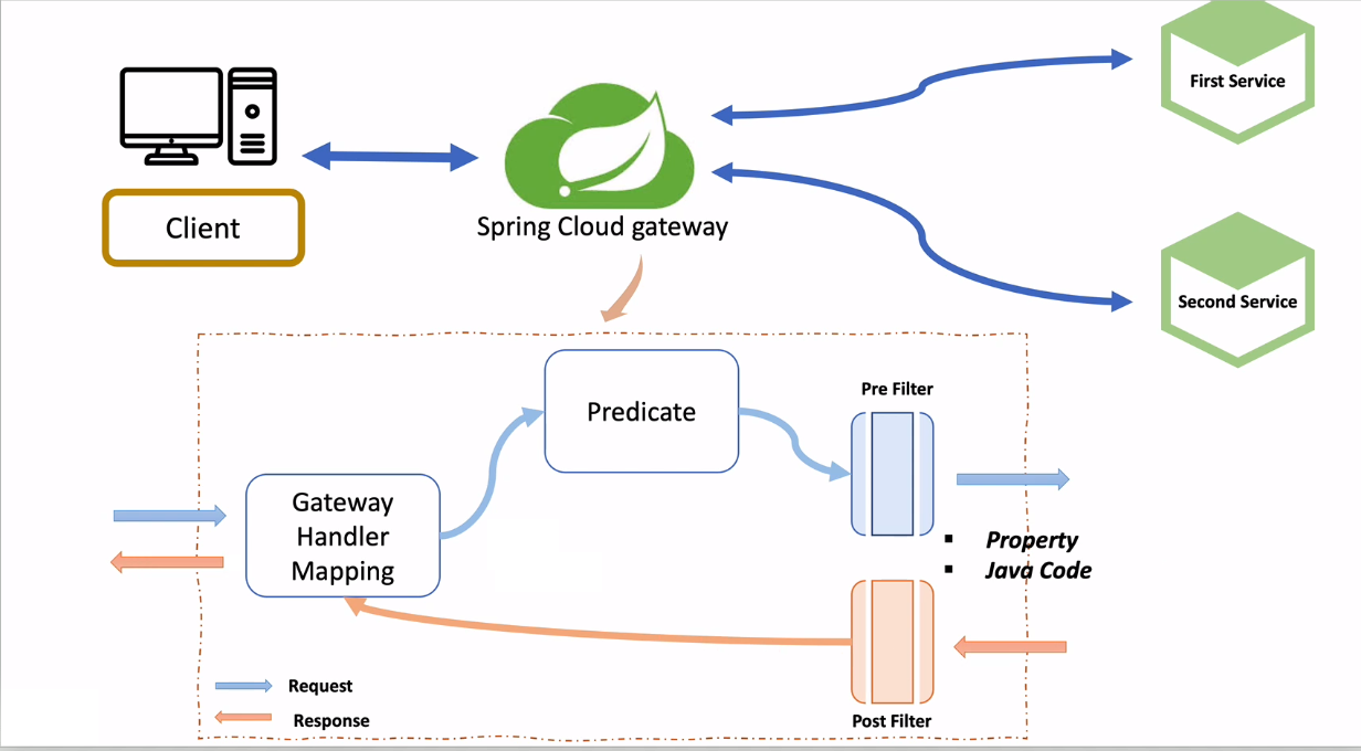 - 요청 -> SpringCloudGateWay -> Predicate -> PreFilter -> Service -> PostFilter