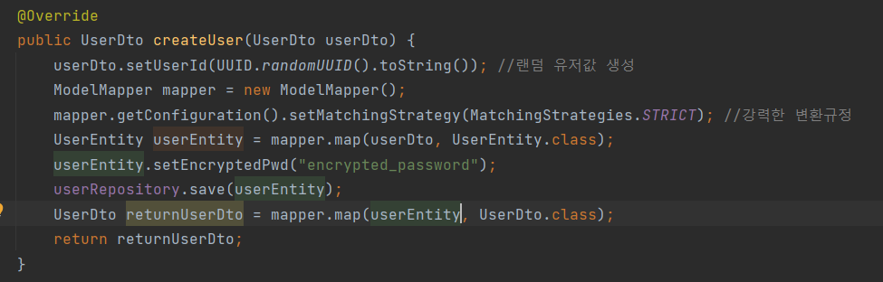 - UserDto -> UserEntity로 modelMapper를 사용하여 변환한다