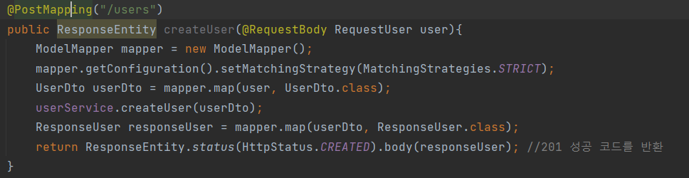 - ModelMapper를 사용하여 UserRequest를 UserDto로 변환하였다