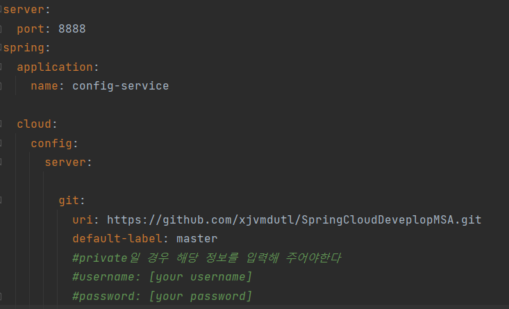 git에 등록되어있는 uri로 yml정보 읽어 오기 - private로 git을 만들었을 경우 username, password를 적어 주어야 한다.