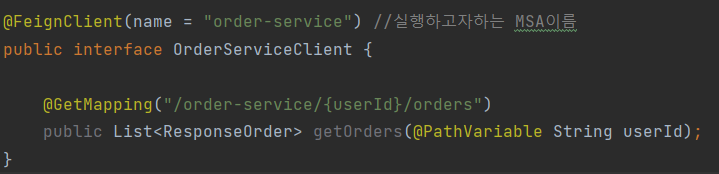 UserService의 OrderServiceClient 인터페이스 생성 - 실행하고자 하는 MSA의 이름을 @FeignClient의 name속성으로 전달한다.