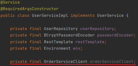 UserServiceImpl의 getUserByUserId 메소드 수정 - 기존에 사용하던 RestTemplate은 주석처리하여 동작하지 않도록 하고, 실제 같은 Application에 있는 듯이 사용하기만 하면 된다.
