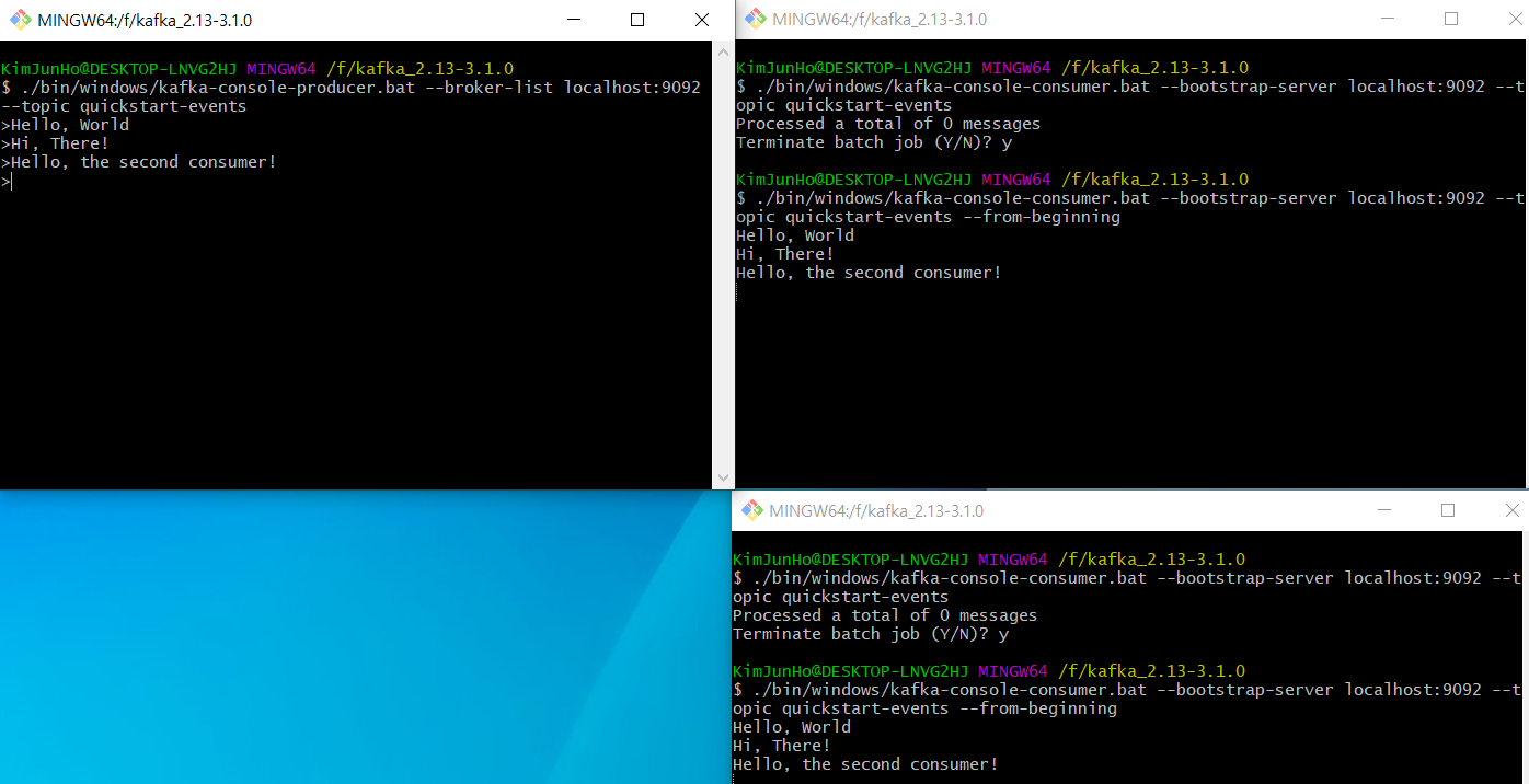 - ./bin/windows/kafka-console-consumer.bat --bootstrap-server localhost:9092 --topic quickstart-events --from-beginning