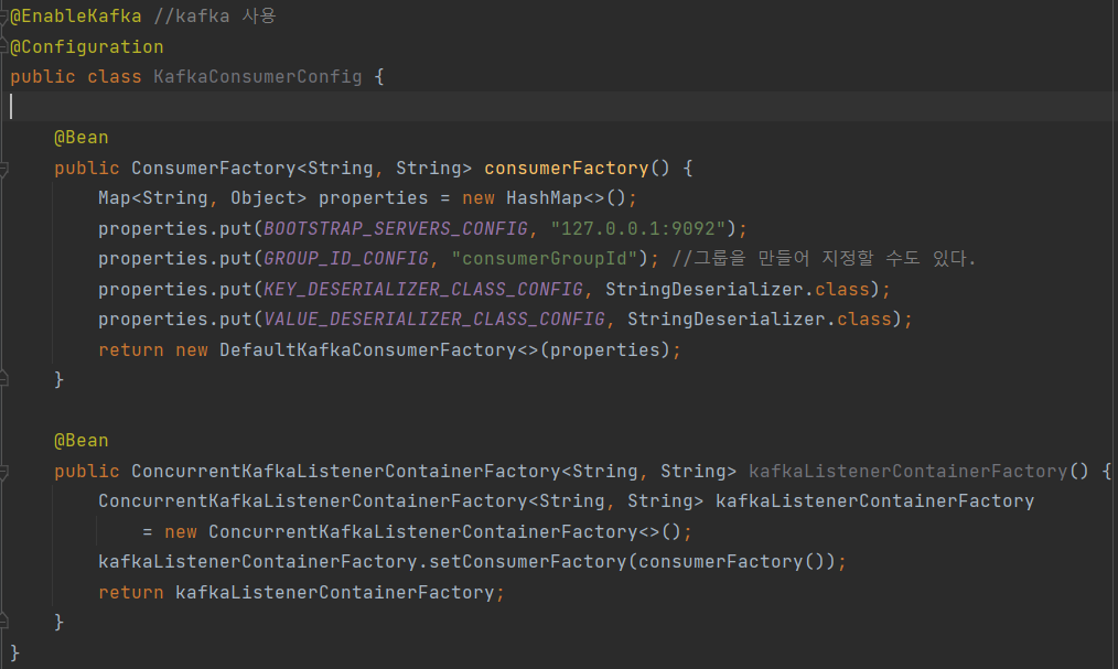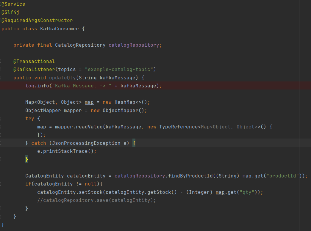 - @KafkaListener를 통해 어떤 Topic에 변경을 감지할지를 작성한다.