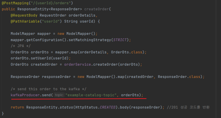 OrderService.Controller에 KafkaProducer를 주입받는다