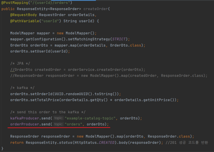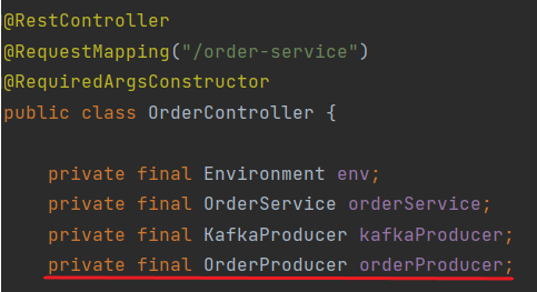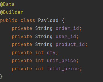 • payload, field, schema를 생성하고, 이를 kafkaOrderDto에 주입한다.