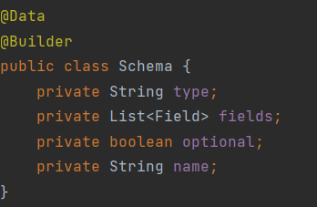 • Schema, Field, Payload 형태의 JSON 형태로 전송해야하기 때문에 클래스로 만들 것이다.