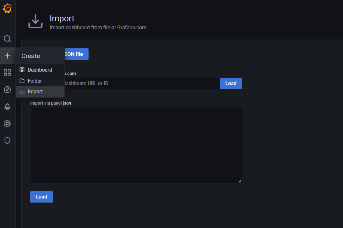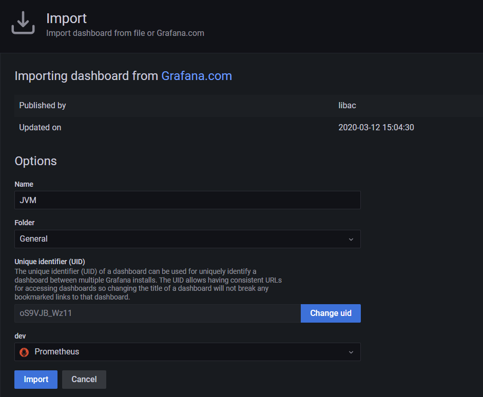 import 클릭하여 그라파다에서 제공하는 dashboard를 임포트 받는다