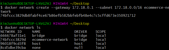네트워크 생성, 검색 - gateway와 subnet 을 지정하지 않고 만들 수 있지만 수동으로 IPAddress를 지정하여 컨테이너를 동작시킬 때 오류가 발생할 수 있으므로 지정하고 만드는 것이 좋다.