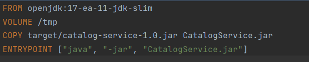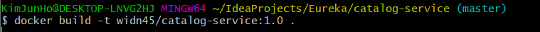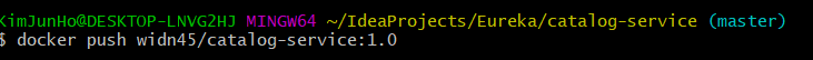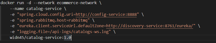 docker run -d --network ecommerce-network \ --name catalog-service \ -e "spring.cloud.config.uri=[config 서버]" \ -e "spring.rabbitmq.host=[rabbitMQ 서버]" \ -e "eureka.client.serviceUrl.defaultZone=[유레카 서버]" \ -e "logging.file=[로그파일 등록]" \ widn45/[이미지 파일]:[tag]
