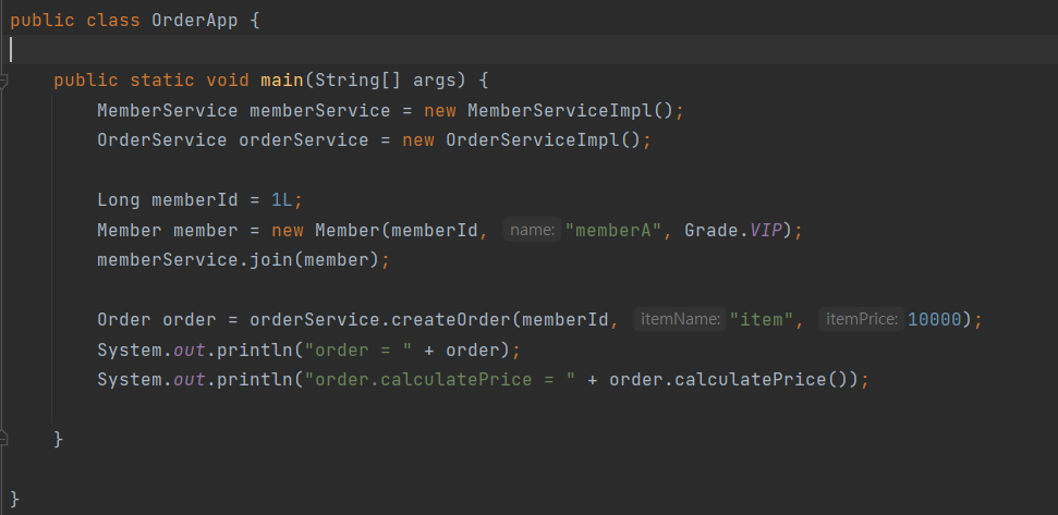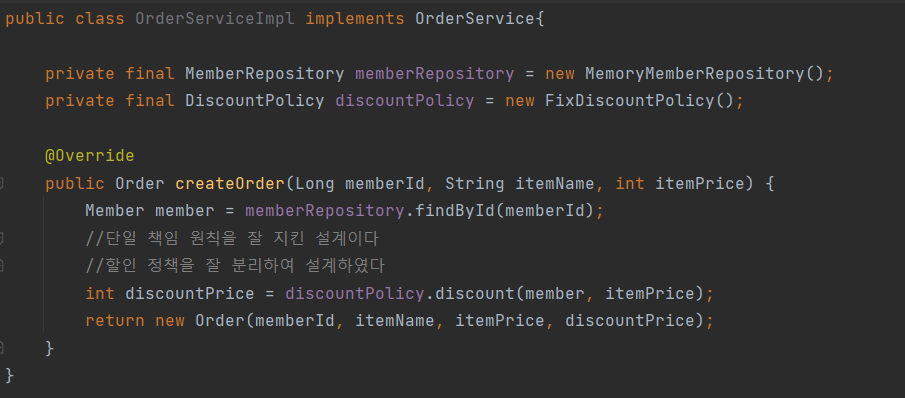 OrderServiceImpl - 단일 책임의 원칙을 잘 지킨 걸 알 수 있다(할인 정책-회원)을 잘 분리했다