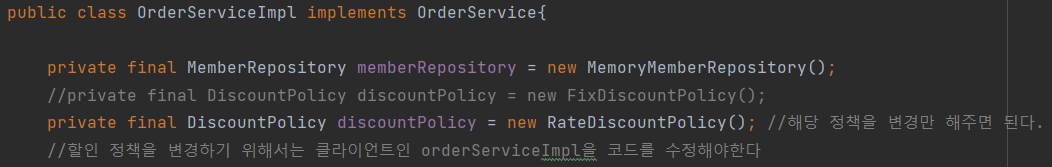 • 클라이언트 코드인 OrderServiceImpl 은 DiscountPolicy 의 인터페이스 뿐만 아니라 구체 클래스도 함께 의존한다.