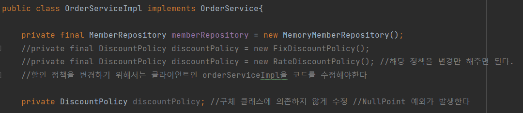• DIP: 주문서비스 클라이언트( OrderServiceImpl )는 DiscountPolicy 인터페이스에 의존하면서 DIP를 지킨 것 같은데?