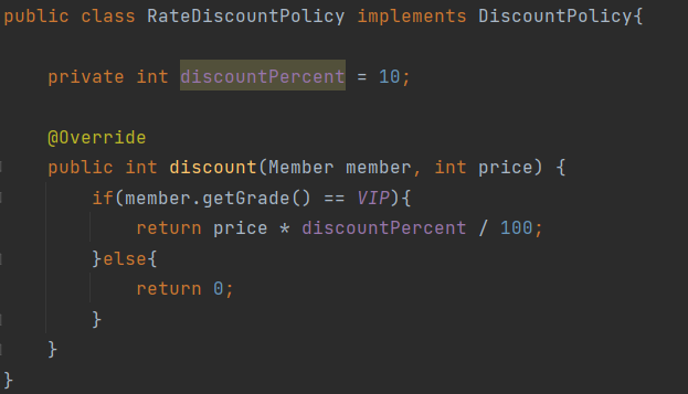 - 악덕 기획자: 서비스 오픈 직전에 할인 정책을 지금처럼 고정 금액 할인이 아니라 좀 더 합리적인 주문 금액당 할인하는 정률% 할인으로 변경하고 싶어요. 예를 들어서 기존 정책은 VIP가 10000원을 주문하든 20000원을 주문하든 항상 1000원을 할인했는데, 이번에 새로 나온 정책은 10%로 지정해두면 고객이 10000원 주문 시 1000원을 할인해주고, 20000원 주문 시에 2000원을 할인해주는 거예요!