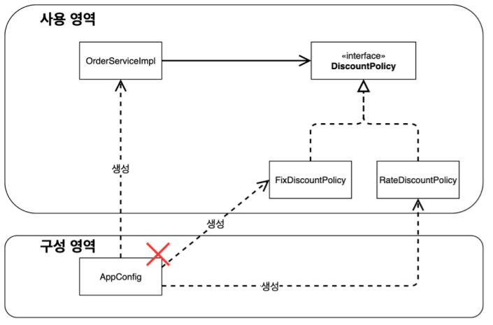 - 이제 할인 정책을 변경해도, 애플리케이션의 구성 역할을 담당하는 AppConfig만 변경하면 된다. 클라이언트 코드인 OrderServiceImpl를 포함해서 사용 영역의 어떤 코드도 변경할 필요가 없다.