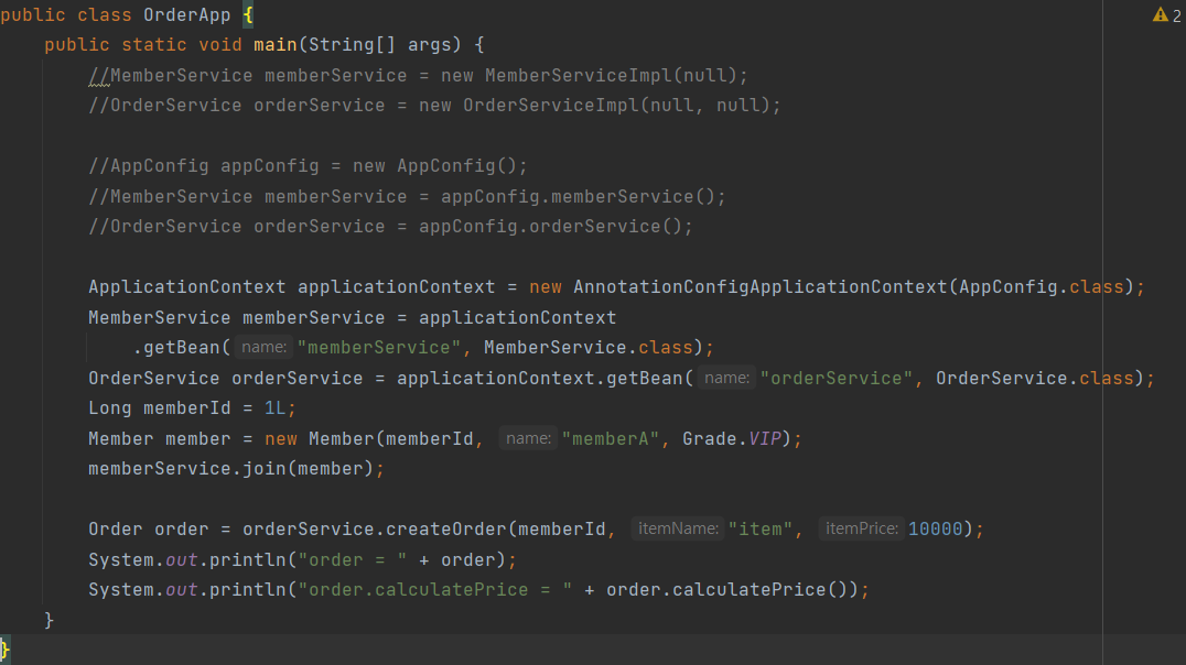 Spring이 등록한 ApplicationContext를 통해 Bean으로 등록된 memberService, orderService를 읽어온다.