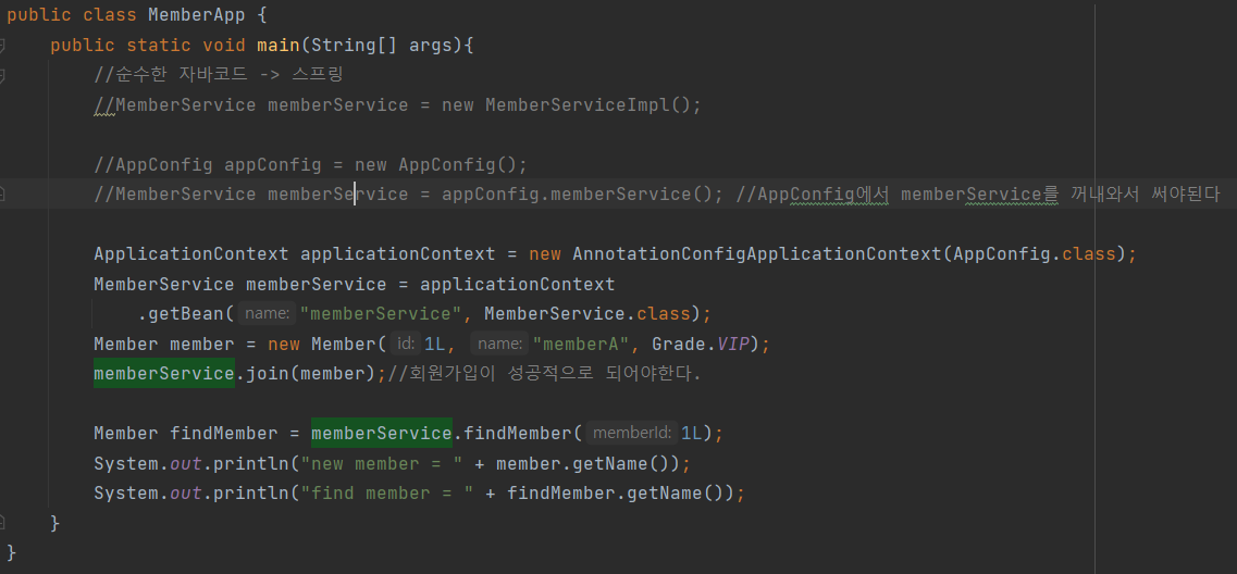 Spring이 등록한 ApplicationContext를 통해 Bean으로 등록된 memberService를 읽어온다.
