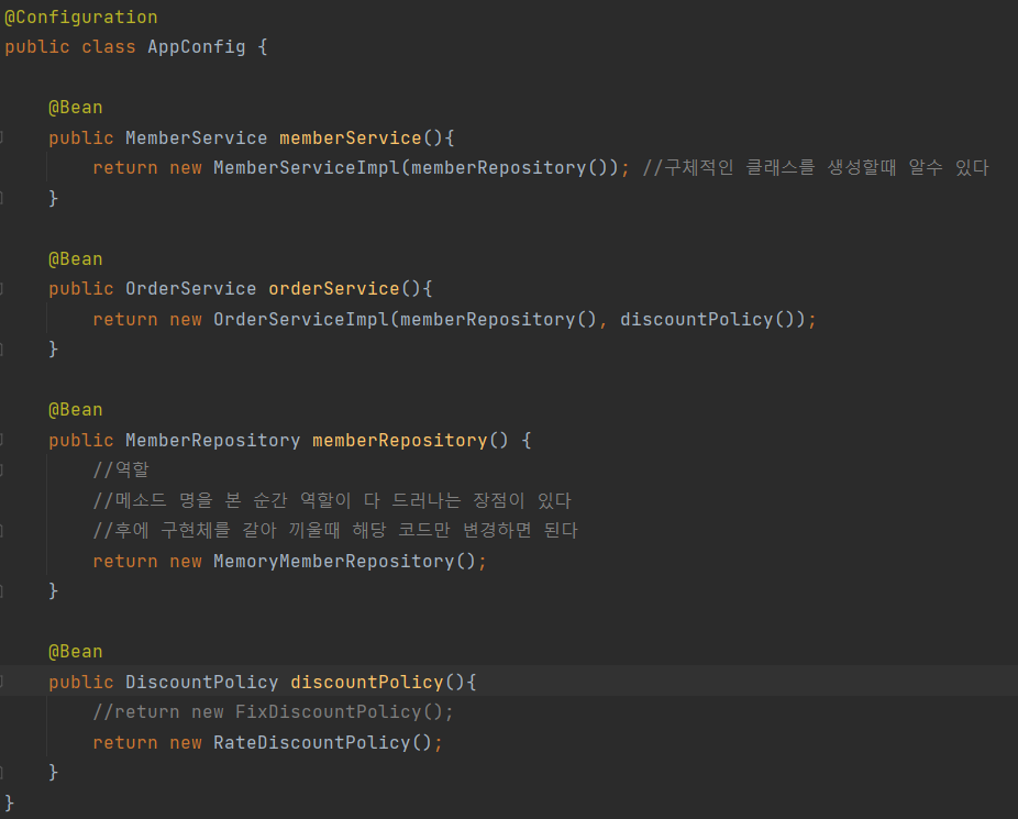 - 스프링 빈은 @Bean 이 붙은 메서드의 명을 스프링 빈의 이름으로 사용한다. ( memberService , orderService )