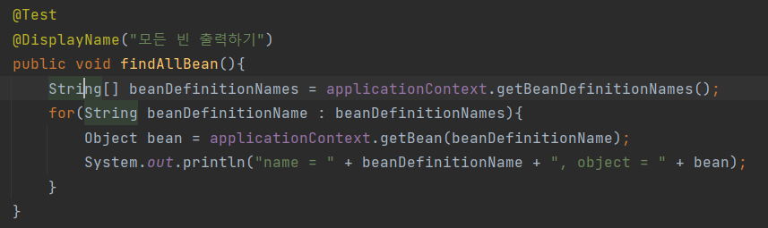 등록된 모든 빈을 확인할 수 있다. - applicationContext.getBeanDefinitionNames() : 스프링에 등록된 모든 빈 이름을 조회한다.