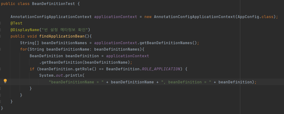- BeanDefinition을 직접 생성해서 스프링 컨테이너에 등록할 수 도 있다. 하지만 실무에서 BeanDefinition을 직접 정의하거나 사용할 일은 거의 없다