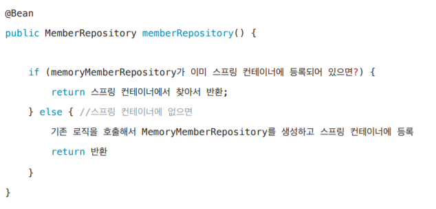 • memberRepository()처럼 의존관계 주입이 필요해서 메서드를 직접 호출할 때 싱글톤을 보장하지 않는다.