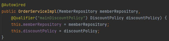 - 그러면 mainDiscountPolicy라는 이름의 스프링 빈을 추가로 찾는다. 하지만 경험상 @Qualifier는 @Qualifier를 찾는 용도로만 사용하는 게 명확하고 좋다.
